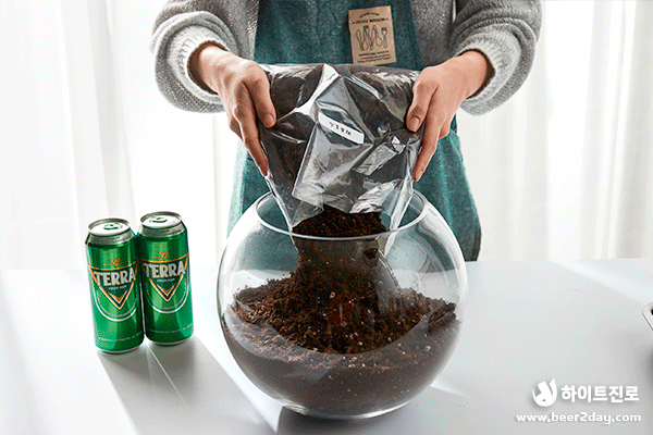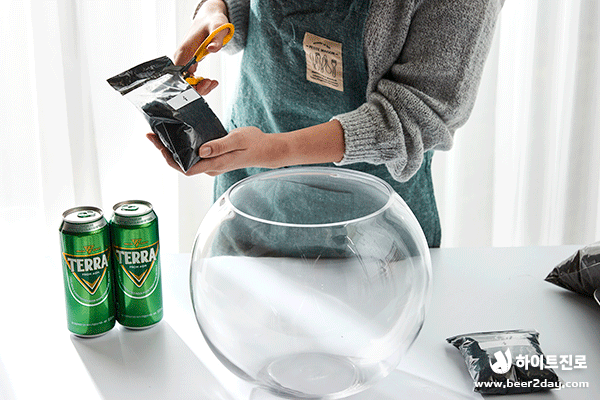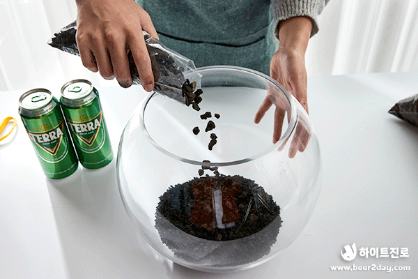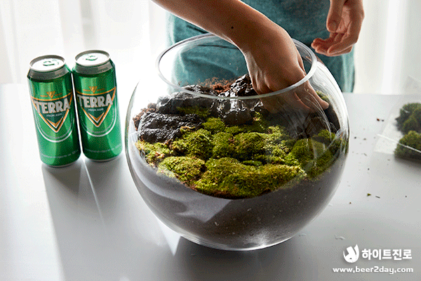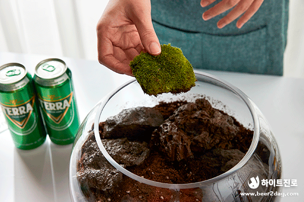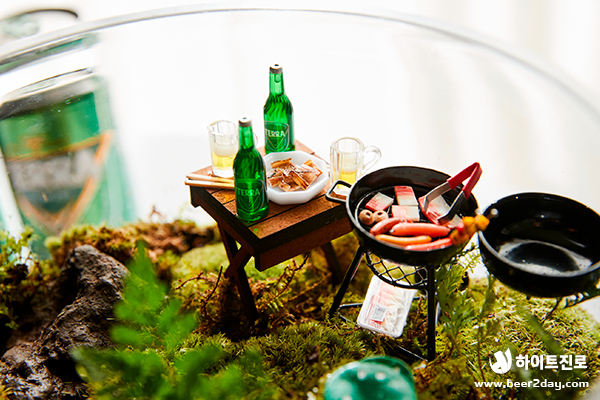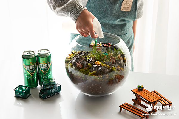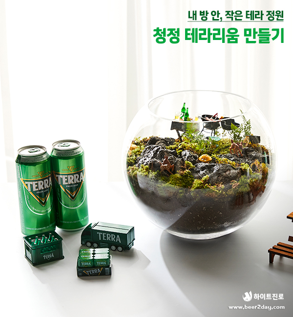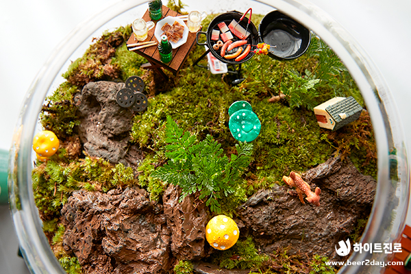 청정, 녹색, 자연하면 떠오르는 것은? 바로 청정라거 테라! 100% 청정맥아, 100% 리얼 탄산으로 테라리움과도 잘 어울리죠! 캠핑, 글램핑 귀여운 버섯, 캠핑 분위기를 연출하는 바비큐 그릴과 테라 미니어처도 넣었어요. 녹색 이끼로 둘러싸인 테라, 영롱하지 않나요?