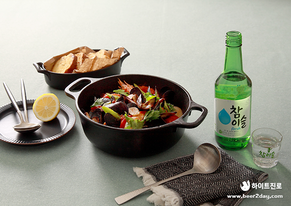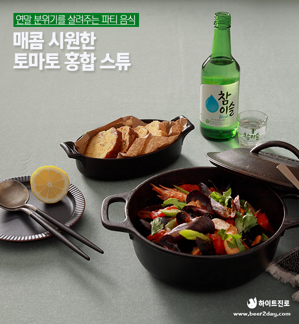 연말 홈파티에서의 맛과 멋을 모두 책임질 토마토 홍합 스튜가 완성되었습니다! 달짝지근한 토마토와 진한 감칠맛의 소유자인 홍합은 완벽한 조화를 이루며 깊은 풍미와 깔끔한 맛을 경험하게 해줍니다. 푹 끓여낸 스튜와 함께 곁들이는 깨끗한 참이슬 한 잔은 올 한 해의 아쉬움과 미련까지 깨끗하게 씻어내는 듯합니다.
