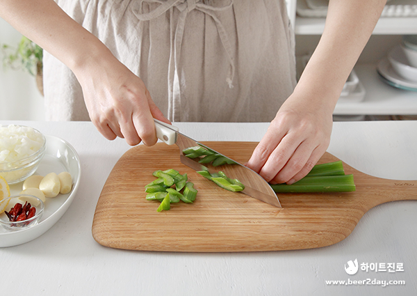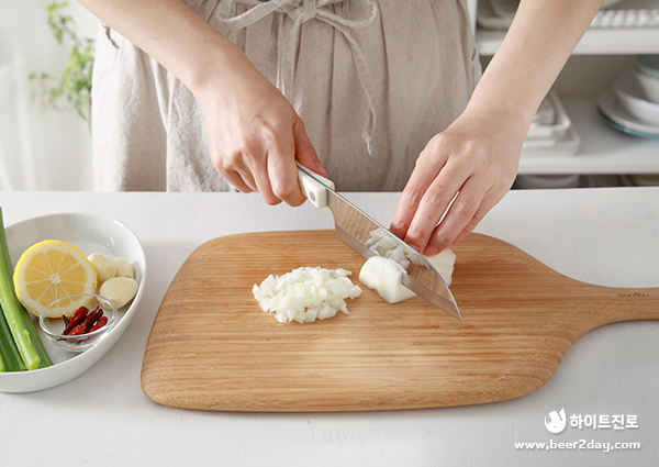 2. 양파를 잘게 다지고 샐러리는 보기 좋게 어슷 썰어줍니다.