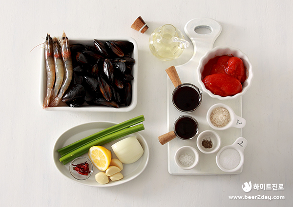 재료 – 홍합 30개, 대하 3마리, 양파 1/2개, 통마늘 4개, 샐러리 1대, 베트남 건 홍고추 5개, 토마토 홀 800g(2캔), 우스터 소스 3큰술, 레드 와인 3큰술, 설탕 2큰술, 소금 1/2작은술, 후춧가루 약간, 올리브유 1큰술, 육수 400ml(치킨스톡 6g)