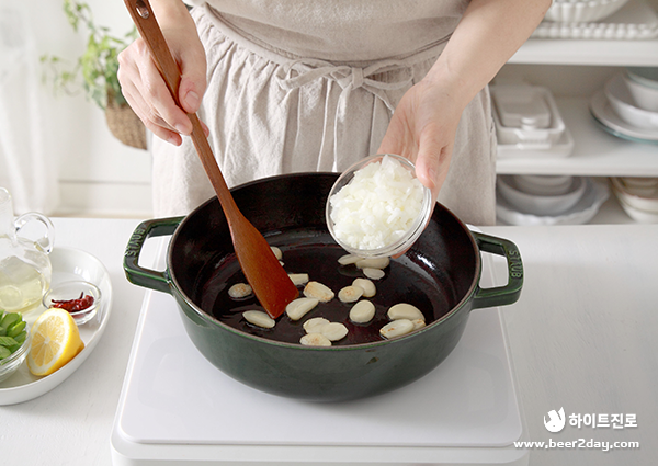 4. 열이 오른 팬에 올리브유를 두르고 슬라이스 한 마늘과 양파를 넣어 볶아줍니다.