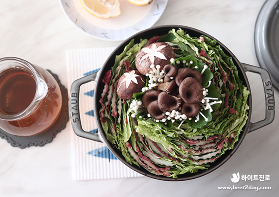집에 있는 재료로도 푸짐한 비주얼을 완성할 수 있는 밀푀유나베! 상큼한 레몬 폰즈 소스나 유자 폰즈 소스까지 함께 곁들여 먹으면 깊은 풍미를 맛볼 수 있답니다. 따끈한 전골 요리하면 빠질 수 없는 초깔끔한 진로 한 잔을 함께 곁들이니 밀푀유나베의 깊은 맛이 더욱 진하게 느껴집니다. 올 크리스마스는 밀푀유나베 한 상으로 친구, 가족, 연인과 함께 따뜻하면서도 멋진 홈 파티를 즐겨 보시는 것은 어떨까요?