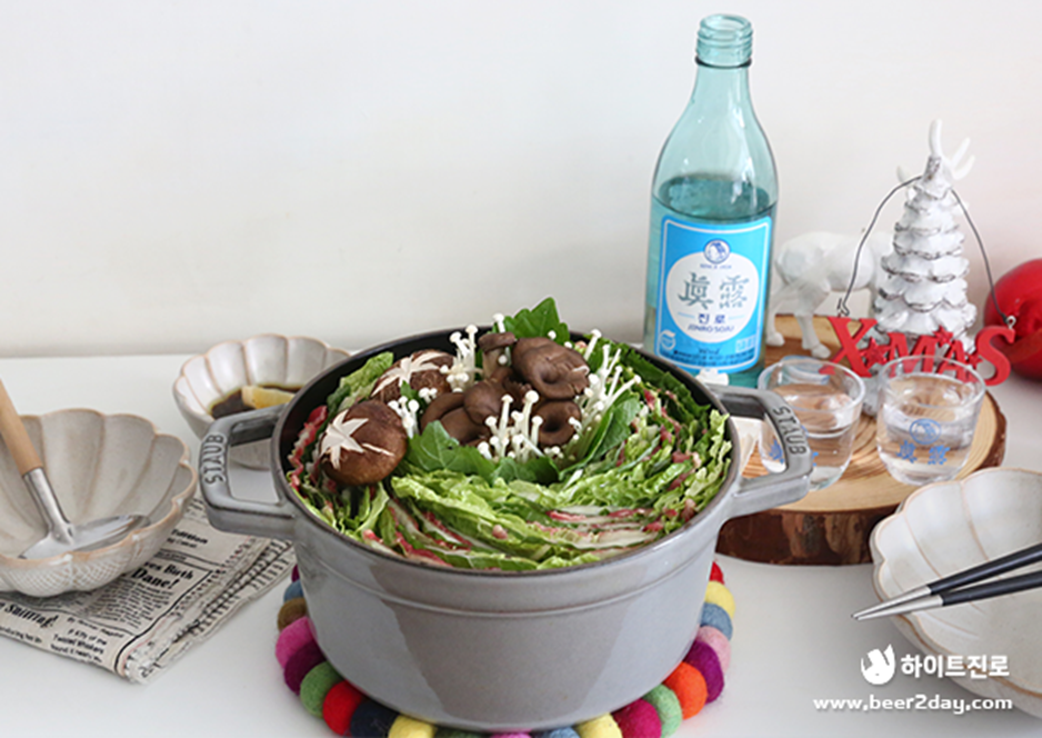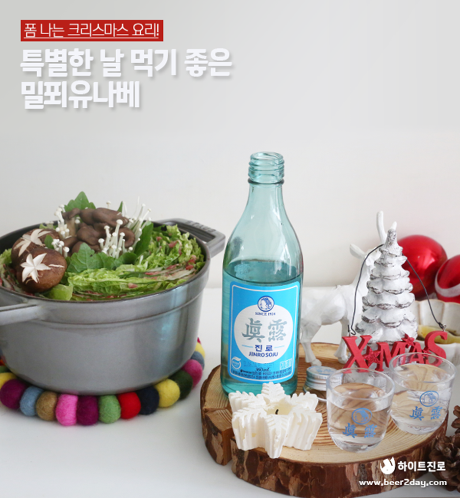 집에 있는 재료로도 푸짐한 비주얼을 완성할 수 있는 밀푀유나베! 상큼한 레몬 폰즈 소스나 유자 폰즈 소스까지 함께 곁들여 먹으면 깊은 풍미를 맛볼 수 있답니다. 따끈한 전골 요리하면 빠질 수 없는 초깔끔한 진로 한 잔을 함께 곁들이니 밀푀유나베의 깊은 맛이 더욱 진하게 느껴집니다. 올 크리스마스는 밀푀유나베 한 상으로 친구, 가족, 연인과 함께 따뜻하면서도 멋진 홈 파티를 즐겨 보시는 것은 어떨까요?