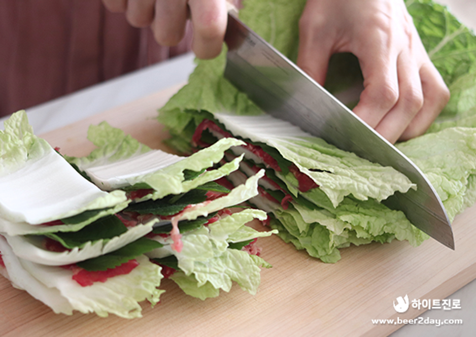 4. 반복된 과정이 끝나면 맨 위에 배추를 올려 6cm 사이즈로 먹기 좋게 잘라줍니다.