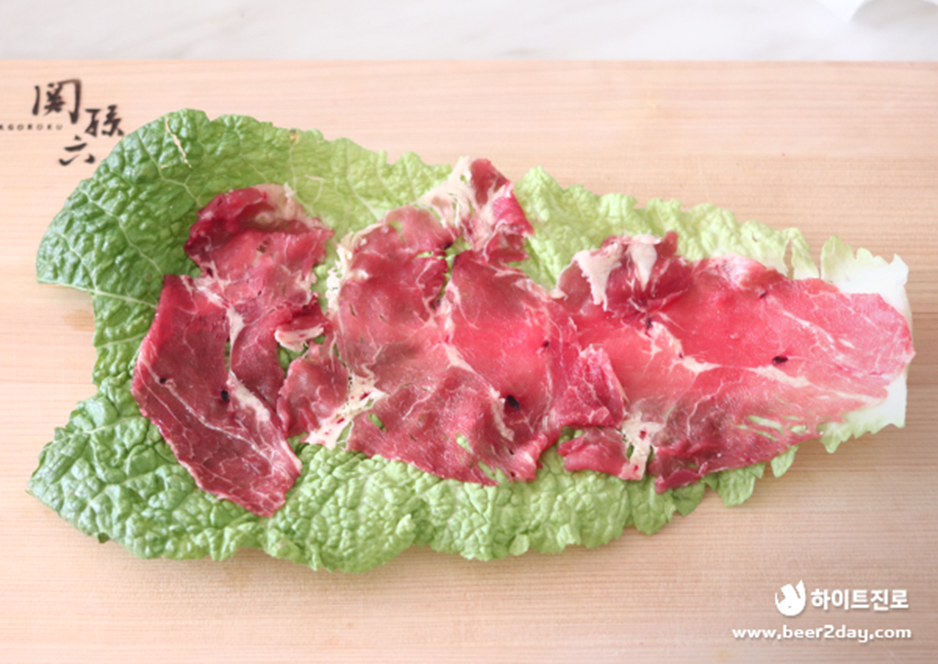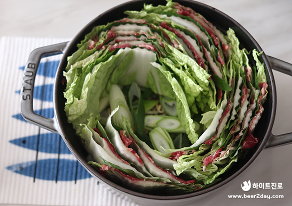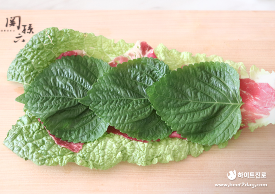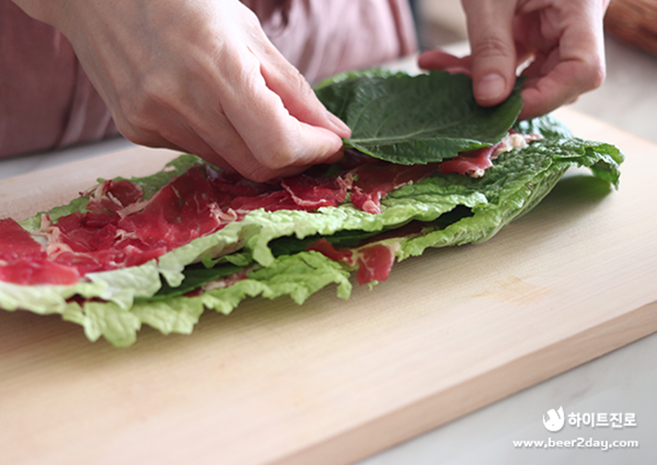2. 배추, 고기, 깻잎 순으로 재료를 차곡차곡 올려주세요.