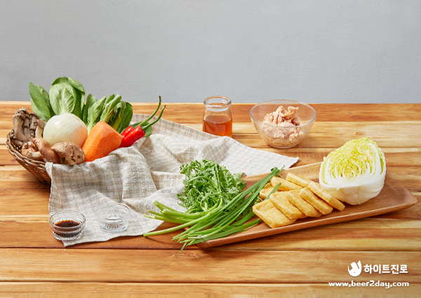 | 재료 : 냉동 유부, 알배추 1/2개, 청경채 1개, 표고버섯 3~4개, 느타리버섯 100g, 당근 1/4개, 양파 1/4개, 쑥갓, 홍고추 1개, 시판 육수 2컵, 닭가슴살 통조림 1캔, 부추 20g, 간장 1t, 소금, 후추 |