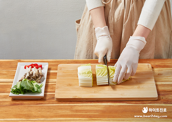 2. 알배추와 청경채는 먹기 좋은 크기로 자르고, 데코용 홍고추는 어슷썰기로 썰어주세요. 느타리버섯은 밑동을 잘라내고 가닥을 떼어주세요.