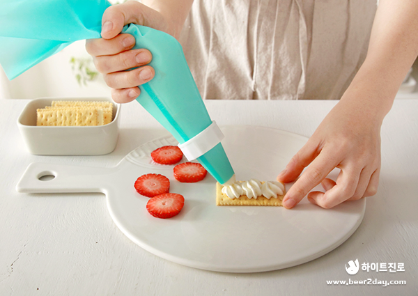 4. 크림을 짤 주머니에 담은 후, 크래커 위에 크림을 짜주세요.