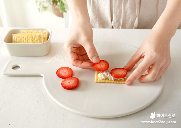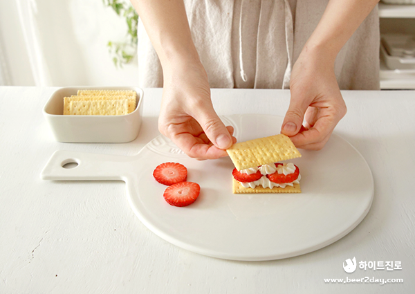 6. 그 위로 딸기와 생크림이 잘 보일 수 있게 크래커를 비스듬히 올려주세요. 이 과정을 한 번 정도 반복해주세요.