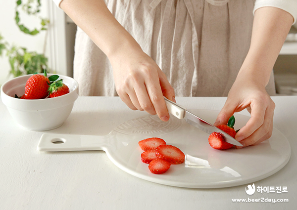 1. 씻은 딸기는 0.3cm 두께로 원형으로 슬라이스 해주세요. 장식용으로 사용할 딸기는 세로로 4등분해주세요.