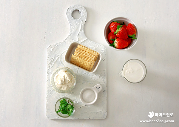 재료(2~3인 기준) – 딸기 12개, 크래커 12개(담백한 맛), 생크림 150ml, 크림치즈 70g, 설탕 1큰 술, 민트 약간