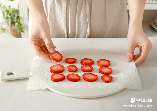 2. 슬라이스 한 딸기는 종이 타월 위에 올려 물기를 제거해주세요.