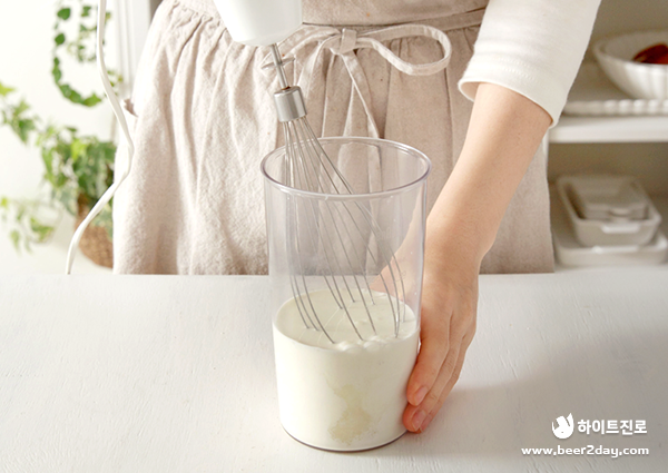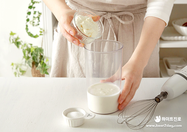 3. 블렌더에 생크림과 크림치즈, 설탕을 넣고 약 5분 동안 크림이 단단해질 때까지 휘핑해주세요.