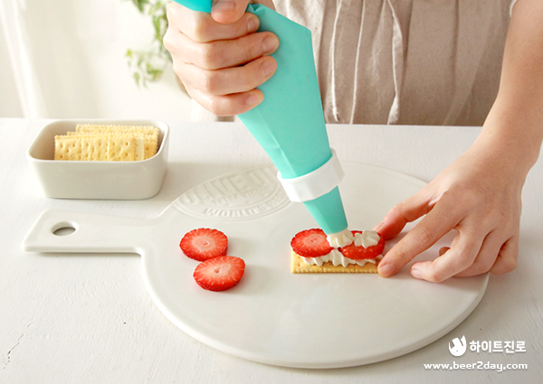 4. 크림을 짤 주머니에 담은 후, 크래커 위에 크림을 짜주세요.