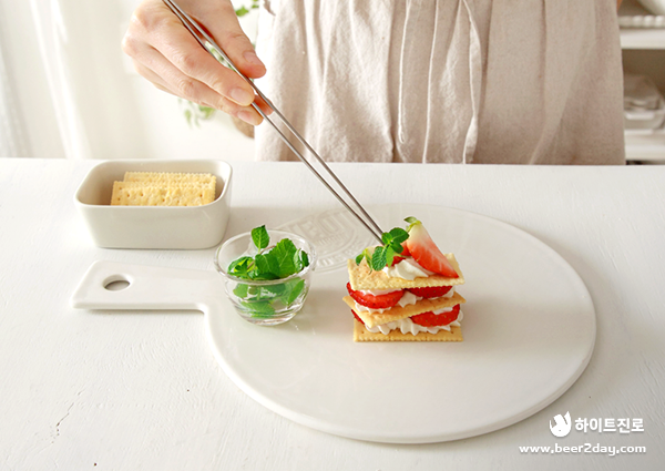 7. 마지막으로 가장 윗부분에 크림을 짜준 뒤 세로로 자른 딸기와 크림, 민트를 얹은 후 슈가 파우더를 솔솔 뿌려주면 간단하지만 고급스러운 딸기 밀푀유 완성!