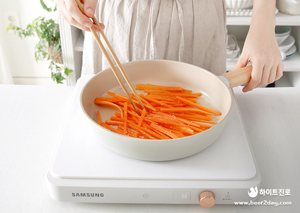 5. 당근은 약 7cm 길이로 채를 썰어주세요. 식용유를 두른 다음 열이 오른 팬에 소금을 살짝 뿌려 볶아주세요.