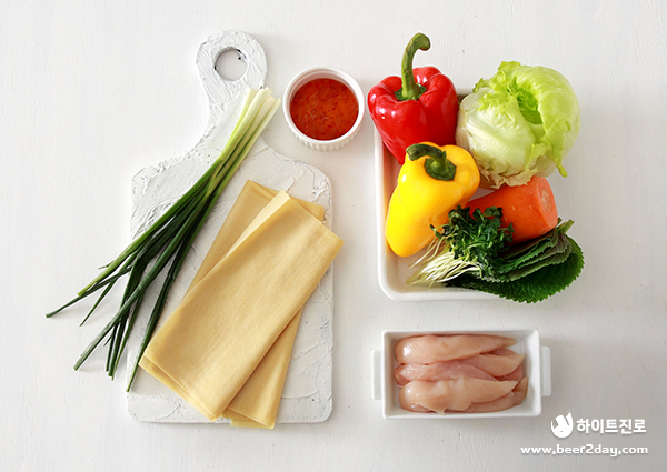 재료(2~3인 기준): 포두부 3장, 닭 안심살 10개(약 1kg), 양상추 3장, 빨강 파프리카 1개, 노랑 파프리카 1개, 7cm 당근 1토막, 깻잎 15장, 무순 한 움큼, 쪽파 7대, 식용유, 소금 약간, 쌀뜨물 1컵, 스위트 칠리 소스 적당량