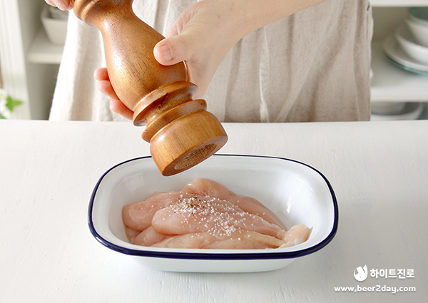 2. 쌀뜨물에 담갔던 닭 안심살을 건져 소금, 후춧가루를 약간씩 뿌려 밑간해주세요.