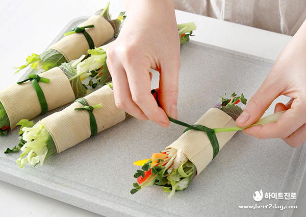 12. 돌돌 말은 포두부를 데친 쪽파로 묶어주면 건강하면서도 맛도 좋은 쌈두부 월남쌈 완성!