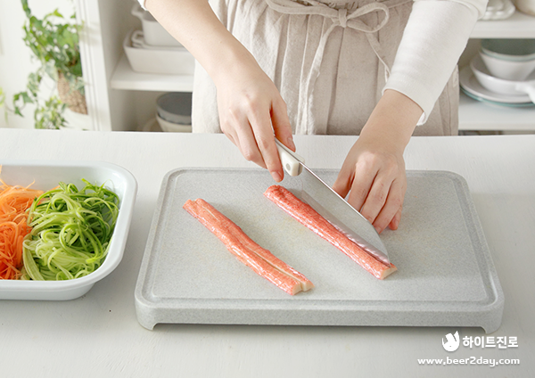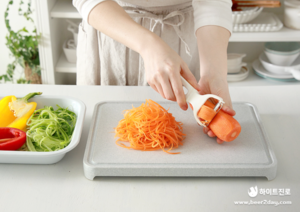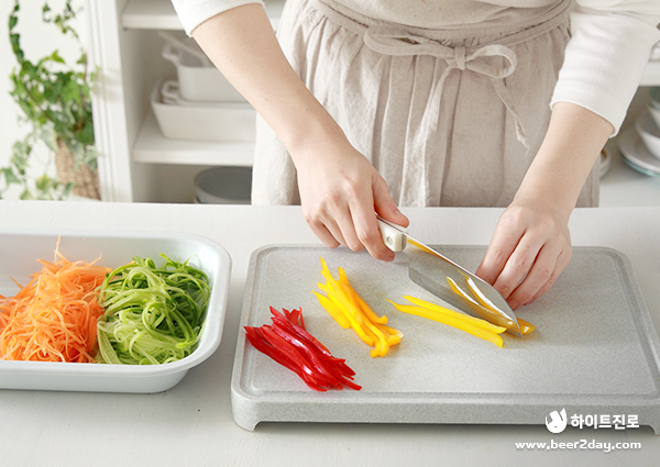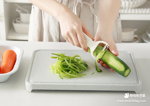 1. 먼저 김밥 속에 들어갈 오이와 당근은 채칼로 곱게 썰어주세요.