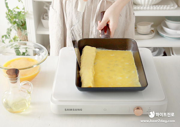 3. 열이 오른 중불의 팬에 식용유를 둘러줍니다. 소금으로 살짝 밑간한 계란물을 조금씩 부어가며 계란 말이를 만들어줍니다.