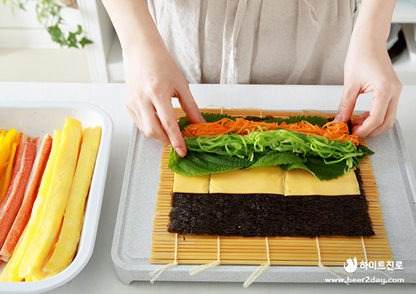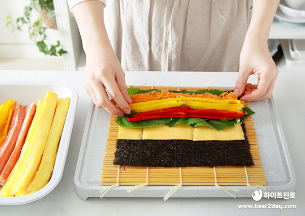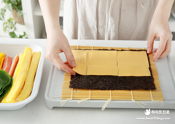 6. 김의 2/3 지점까지 체다 치즈를 넓게 올려주세요.