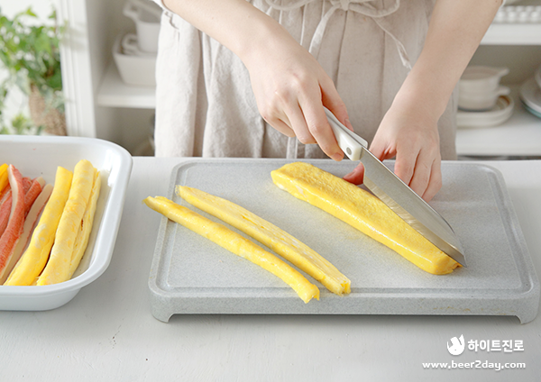 5. 계란말이까지 세로로 두께감 있게 썰어주면 김밥 속 재료 준비 완료!
