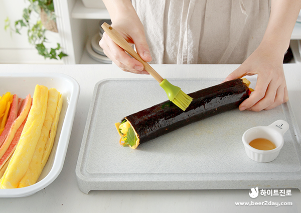 10. 돌돌 말은 김밥 위에 참기름을 발라준 다음, 한 입 크기로 썰어주면 완성!