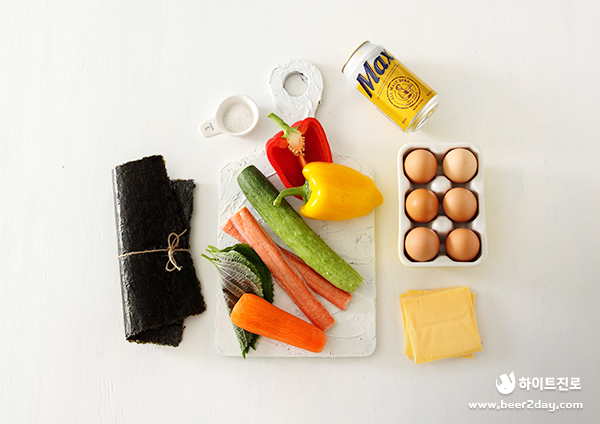 재료: 김 4장, 계란 5개, 게맛살 2개, 당근 1개, 오이 1개, 빨강/노랑 파프리카 1/2개씩, 깻잎 12장, 체다 치즈 15장, 소금, 식용유, 참기름 약간씩