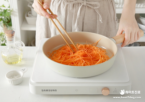 4. 다음으로 센 불의 팬에 오이채와 당근채를 각각 소금으로 살짝 밑간하여 빠르게 볶아줍니다.