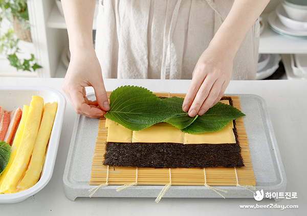 7. 체다 치즈 위에 깻잎을 3장 올려줍니다.