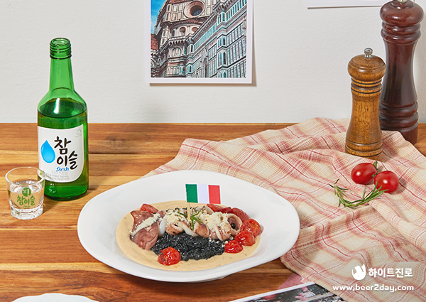 4월 14일, 오늘은 블랙데이(black day)입니다. 밸런타인데이와 화이트데이에 선물을 주고받지 못한 남녀가 모여 짜장면과 같은 블랙푸드를 먹는 날인데요. 올해 아쉽게도 인연을 만나지 못한 분들이라면, 보다 특별한 블랙푸드를 맛보시는 건 어떨까요? 참이슬이 추천하는 블랙 푸드는 ‘오징어 먹물 리소토’입니다. 리소토의 본토는 이탈리아지요. 참이슬과 함께하는 세계여행 3탄, 오늘은 이탈리아로 떠나봅니다.