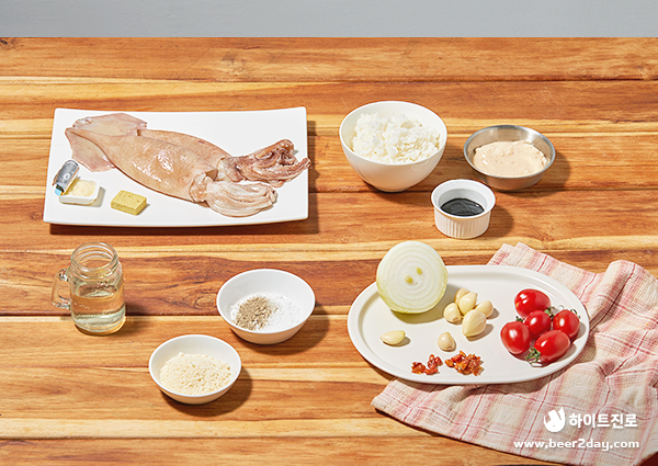 | 재료 : 오징어 1마리, 냉동밥 1공기, 오징어 먹물 10g, 치킨스톡 1T, 물 3cup, 양파 1/2개, 마늘 3개, 시판용 크림소스 200g, 화이트 와인 20ml, 버터 1t, 페퍼론치노 2~3개, 방울토마토 3~4알, 파마산 치즈가루 1T, 소금, 후추, 파슬리 가루 약간, 올리브유 |