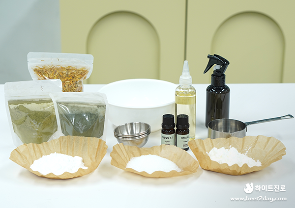 - 보충재료: 천연가루(쑥가루, 모링가가루), 드라이허브(카렌듈라)