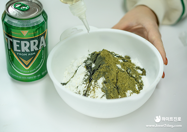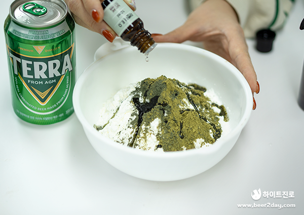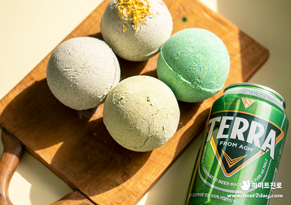 이렇게 청정라거 테라를 닮은 힐링 배쓰밤이 완성되었습니다! 배쓰밤을 물에 넣고 보글보글 피어오르는 거품을 보고 있으면 시원한 테라 한 잔을 따를 때의 느낌이 떠오르기도 하는데요.
