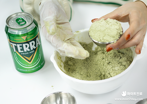 원하는 색감이 나올 만큼 적당량의 천연가루를 넣어줍니다. 비투지기는 테라를 닮은 초록색을 만들기 위해 쑥가루와 모링가 가루를 넣어주었습니다. 천연가루가 없다면 컬러 입욕제를 첨가해 원하는 색을 만들어주세요.