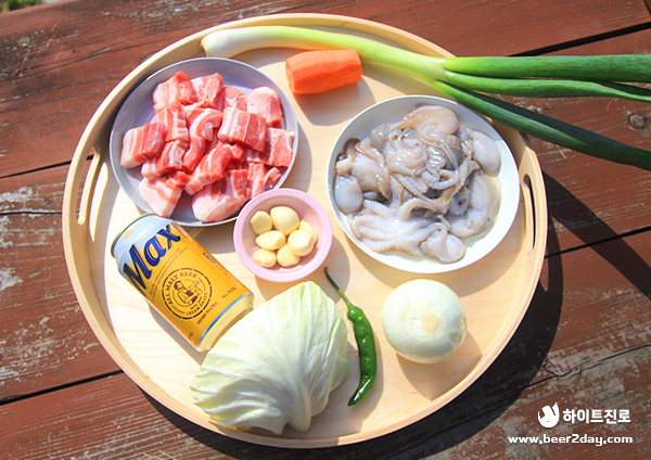 재료: 삼겹살 반 근 300g , 주꾸미 300g, 양배추 1/8쪽, 당근 반 개, 양파 1개, 청양고추 1개, 대파 1대