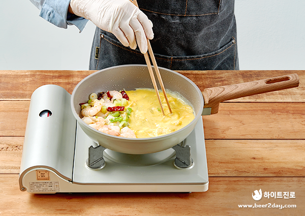 7. 새우가 익으면 팬 한쪽에 모아놓고, 빈 곳에 미리 풀어둔 달걀로 스크램블을 만들어 주세요.