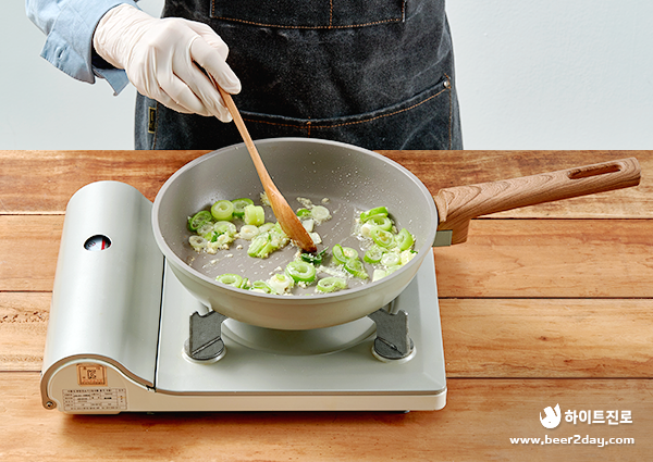 5. 달군 팬에 식용유를 두르고, 송송 썬 대파와 다진 마늘을 넣어 함께 볶아주세요.