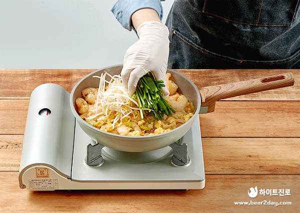 9. 면이 다 익은 후 숙주와 부추를 넣고 잘 섞어주세요.