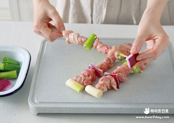 5. 돌돌 말아준 닭목살 사이사이에 대파와 적양파를 하나씩 꽂아 꼬치를 완성해주세요.
