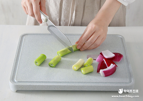 3. 닭목살과 함께 꽂을 대파와 적양파는 한 입 크기로 썰어 준비합니다.