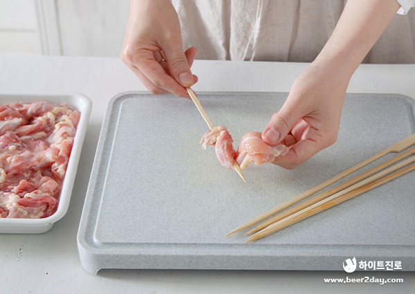 4. 꼬치에 닭목살을 돌돌 말아주고, 양 끝을 꼬치에 꿰어 고정합니다.
