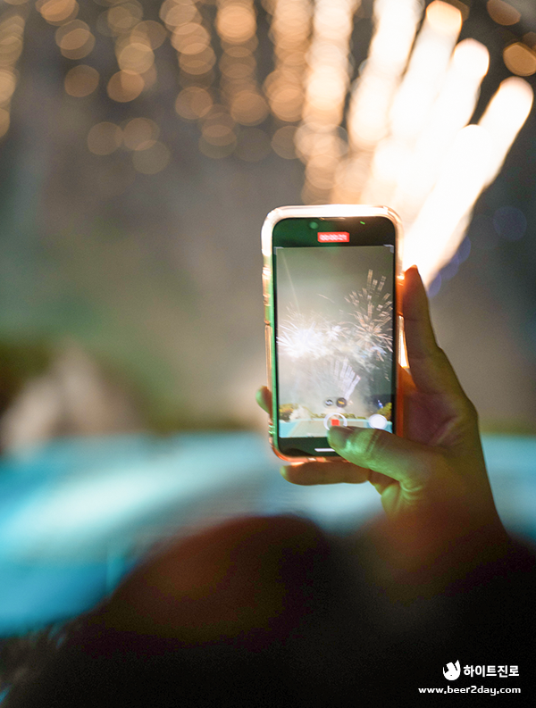 피날레를 앞두고 워터밤 부산의 하이라이트, 불꽃놀이가 시작되었습니다. 참가자들은 터지는 불꽃과 음악에 맞춰 사진을 찍거나 춤을 추면서 축제의 순간을 만끽했는데요.