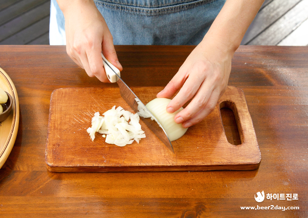 6. 올리브유를 둘러 예열한 팬에 다진 양파, 마늘, 청양고추를 넣어 볶아주세요.
