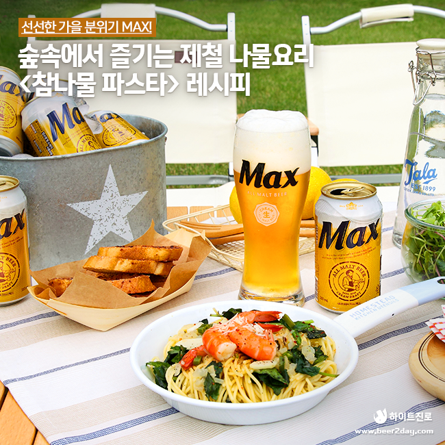 가을의 향을 머금은 참나물파스타를 완성했습니다! 비투지기는 부드러운 맥스를 더해 풍미 가득한 캠핑요리 한 상을 차려보았는데요.