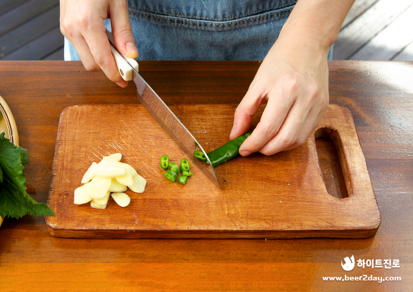 2. 마늘은 편썰기 하고, 청양고추도 잘게 썰어주세요.