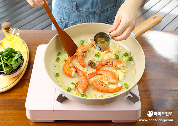 7. 양파가 투명하게 변하면 새우를 넣어 볶아주세요.