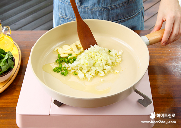 6. 올리브유를 둘러 예열한 팬에 다진 양파, 마늘, 청양고추를 넣어 볶아주세요.