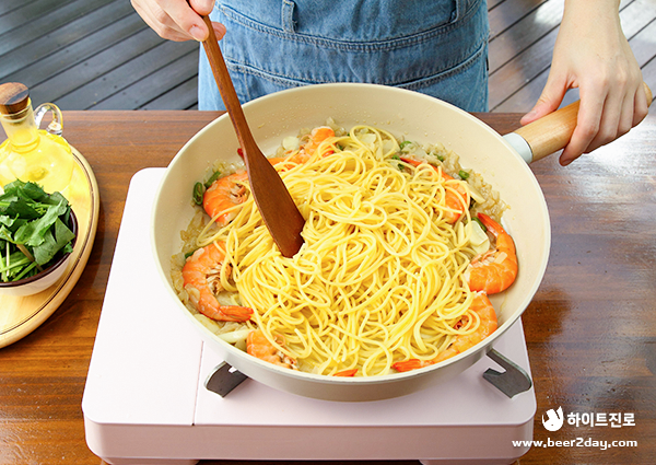 8. 새우의 껍질이 붉게 변하면 앤초비 페스토, 화이트 와인을 넣어 살짝 볶아주고, 삶은 파스타를 넣어 마저 볶아주세요. 면과 재료가 잘 섞이도록 면수를 더해가면서 파스타의 농도를 조절해주세요.